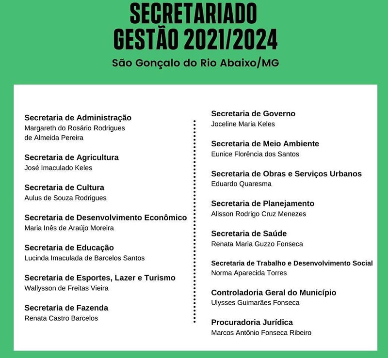 Na manhã deste sábado, 02 de janeiro de 2021, o prefeito de São Gonçalo do Rio Abaixo, Raimundo Nonato Barcelos (Nozinho) e seu vice, Leandro Amora de Castro (Léo Amora), já iniciaram os trabalhos junto ao novo secretariado do município.