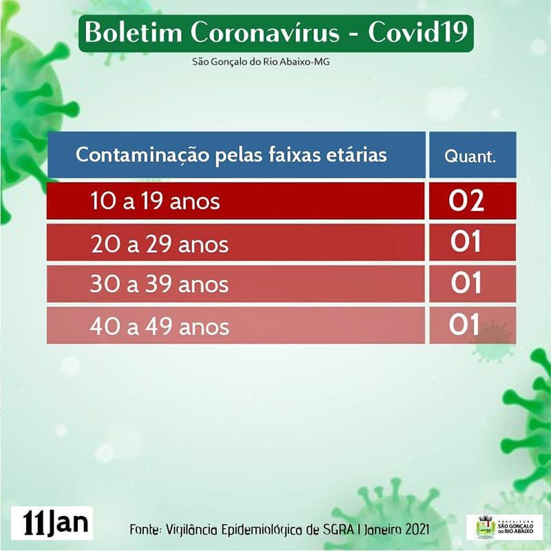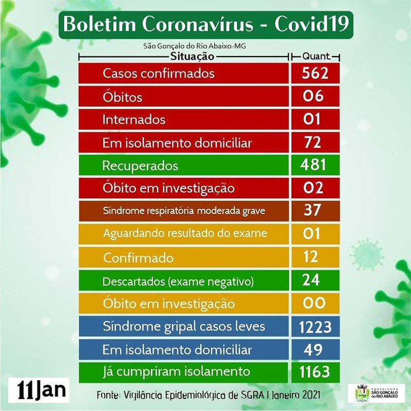 Nesta segunda-feira, 11 de janeiro de 2021, o Pronto Atendimento registrou três casos positivos da Covid19 e mais dois registros feitos pela empresa Vale. Ao todo foram cinco (5) novos casos do coronavírus na cidade de São Gonçalo do Rio Abaixo (MG).