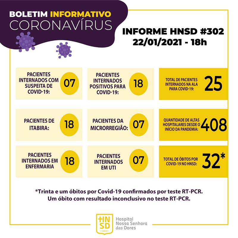 O Boletim Epidemiológico do Hospital Nossa Senhora das Dores (HNSD) divulgado nesta tarde de sábado (23/01), o óbito, teve diagnóstico para Covid-19 confirmado por teste PCR.