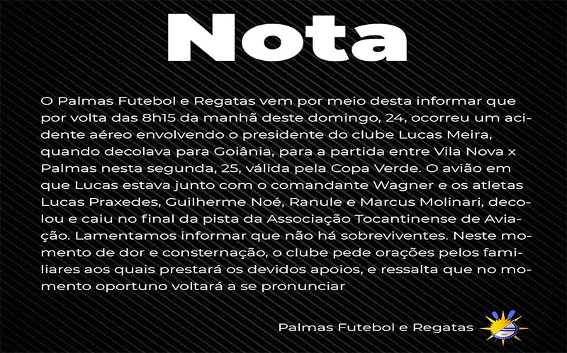 A família Palmas FR está de luto pela perda inestimável do presidente Lucas Meira, dos atletas Guilherme Noé, Lucas Praxedes , Marcus Molinares Reis, Ranule Gomes e do comandante Wagner. Agradecemos as manifestações de apoio e carinho nesse momento de dor.