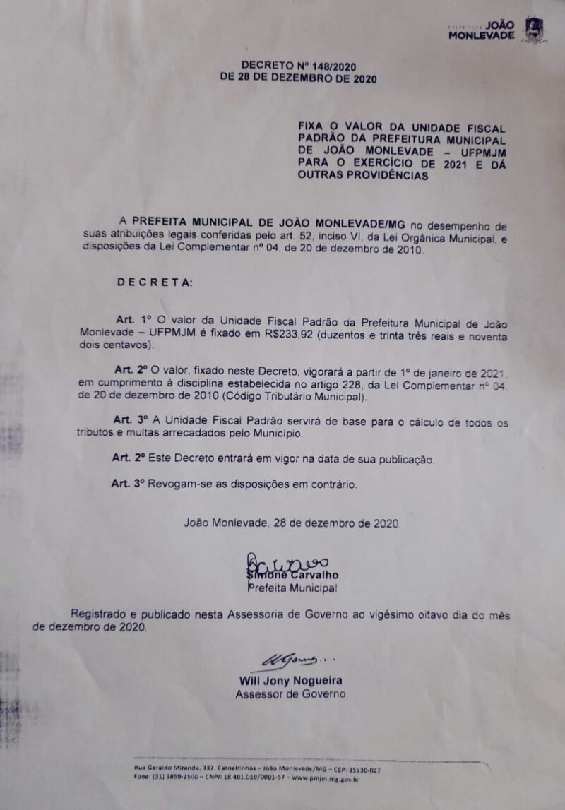 O Imposto Predial e Territorial Urbano (IPTU) de João Monlevade terá reajuste de 24,52% em 2021, com base no Índice Geral de Preços do Mercado (IGPM), Art. 250, da Lei Complementar 04/2010 – Código Tributário Municipal. O aumento ocorre de acordo com o Decreto Municipal nº 148, assinado pela ex-prefeita Simone Moreira (PTB), no dia 28 de dezembro de 2020.