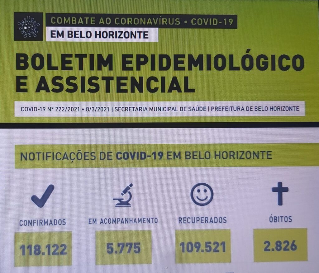O Boletim Informativo da Covid-19 da Prefeitura Municipal de Belo Horizonte (MG), divulgado nesta segunda-feira (08/03), destaca que o município tem 118.122 casos confirmados e 2.826 óbitos registrados. Veja os números abaixo: