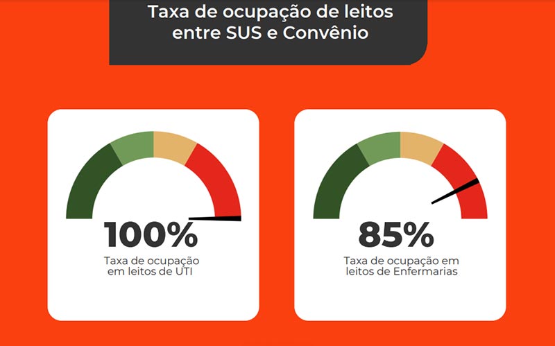 A taxa de ocupação dos leitos de Unidade de Terapia Intensiva (UTI), para pacientes com coronavírus continua em 100%. Os leitos de enfermaria, a taxa de ocupação está em 85% da sua capacidade.