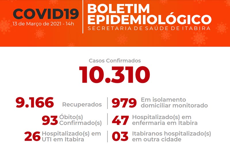 O boletim epidemiológico divulgado neste sábado (13/03) aponta que Itabira registrou mais um (01) óbito por coronavírus. Ainda de acordo com o Boletim de hoje, Itabira confirmou mais 154 novos casos da covid-19, totalizando 10.310 infectados.
