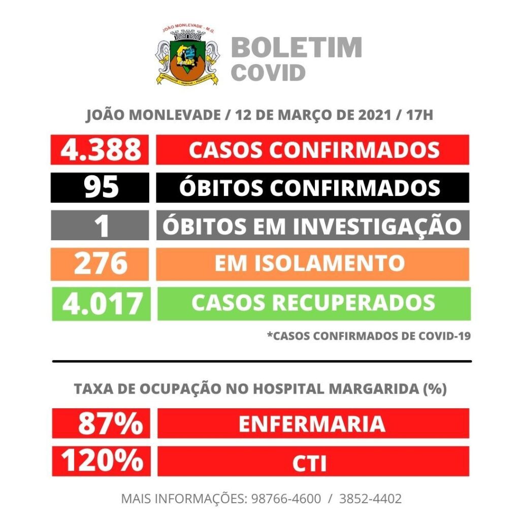 O boletim epidemiológico covid-19 da Prefeitura Municipal de João Monlevade (MG), divulgado nesta sexta-feira (12/03/21), mostra que o município tem 4.388 casos confirmados e 95 óbitos registrados. Veja os números: