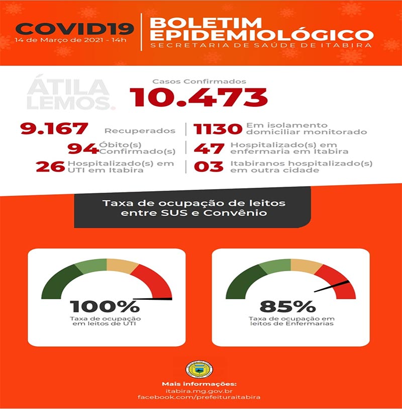 Em seu boletim epidemiológico deste domingo, 14 de março de 2021, a Prefeitura de Itabira comunicou que atualmente 1.130 pessoas seguem em isolamento domiciliar; um total de 9.167 pessoas já se recuperaram da doença.
