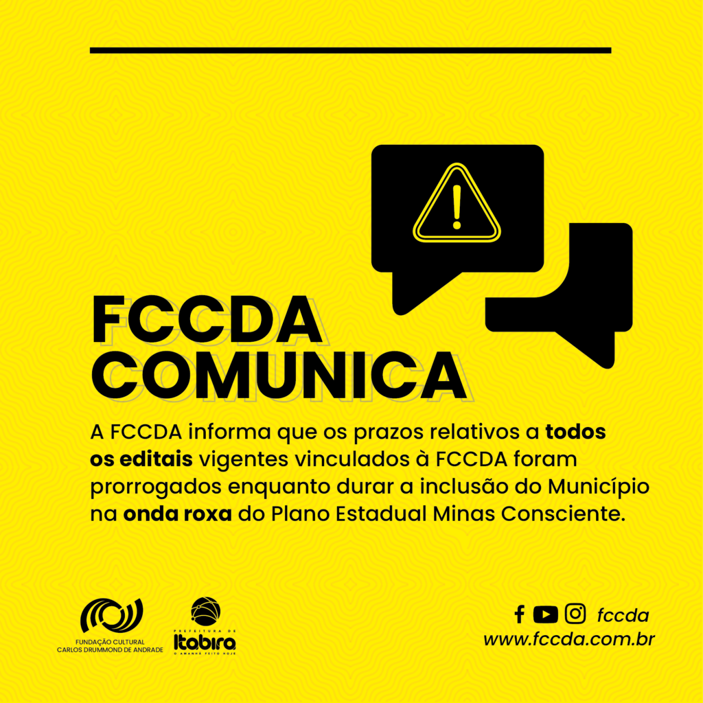 FCCDA prorroga prazos de editais enquanto durar Onda Roxa. A Fundação Cultural Carlos Drummond de Andrade informa que os prazos relativos a todos editais vigentes, a ela vinculados, foram prorrogados enquanto o Município de Itabira permanecer na “Onda Roxa” do Plano Estadual Minas Consciente, para manter intactas as finalidades dos editais. Após a mudança de […]
