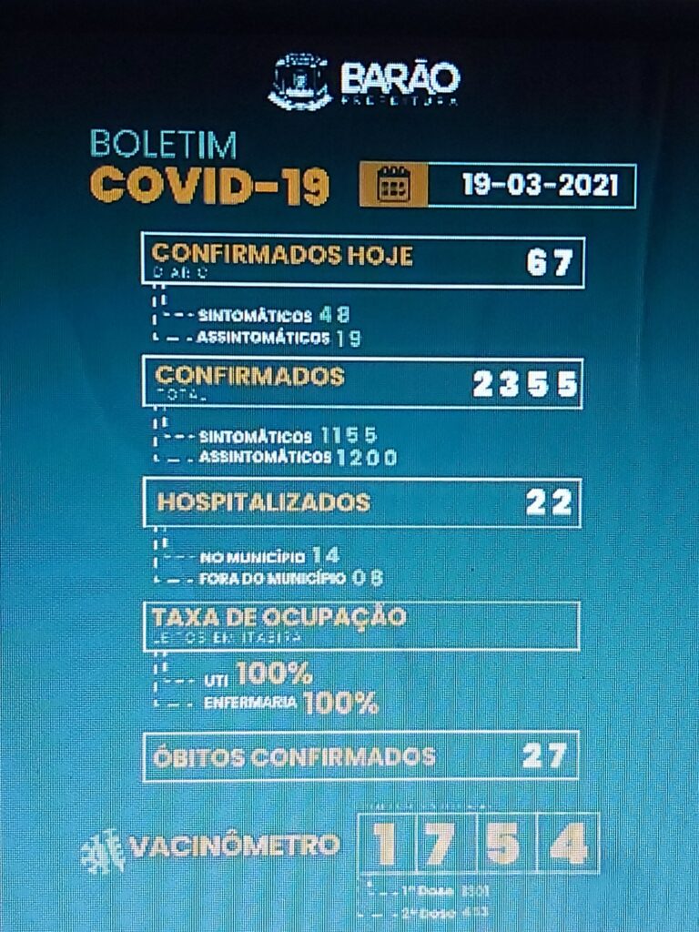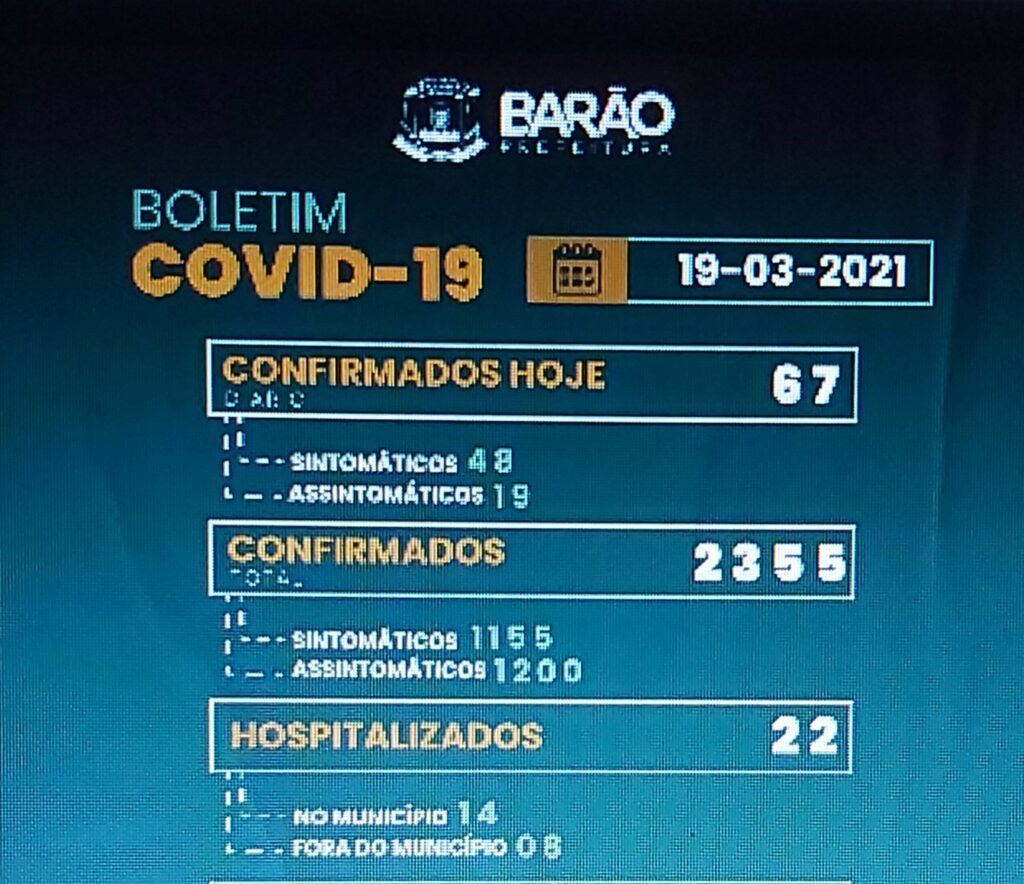O Boletim Epidemiológico Coronavírus referente à cidade de Barão de Cocais (MG), divulgado nesta sexta-feira (19/03), mostra que o município tem 2.355 casos confirmados e 27 óbitos registrados. Veja os números abaixo: