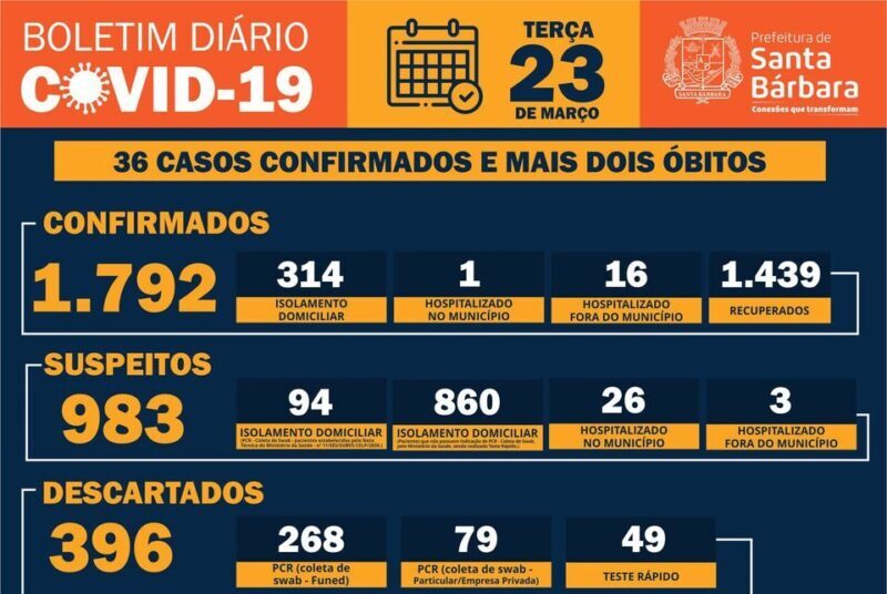 Ver mais + O Boletim Epidemiológico Covid-19 da Prefeitura Municipal de Santa Bárbara (MG), divulgado nesta terça-feira (23/03/21), mostra que o município tem 1.792 casos confirmados e 22 óbitos registrados. Veja o boletim completo: Veja também Covid-19: Agência do Bradesco é fechada para higienização https://atilalemos.com.br/2021/03/23/itabira-chora-mais-8-obitos-por-covid-e-204-novos-casos-de-infectados/