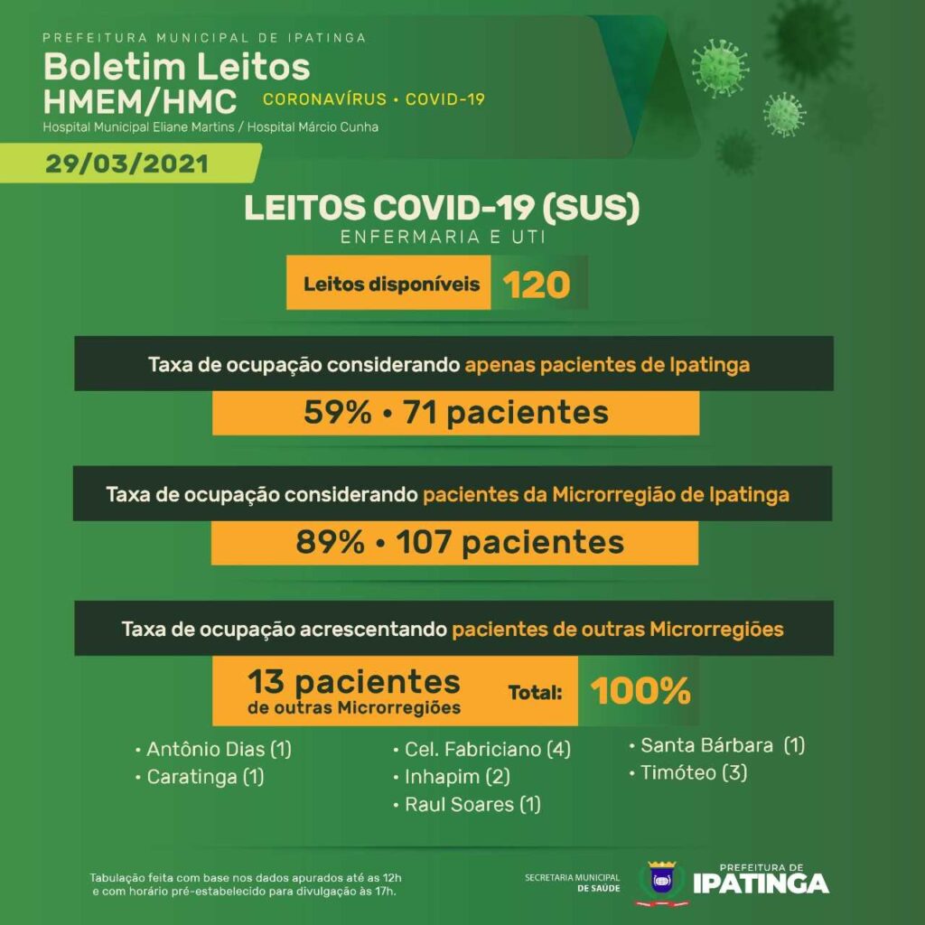 O Boletim Epidemiológico Covid-19 da Prefeitura Municipal de Ipatinga (MG), divulgado nesta segunda-feira (29/03), mostra que o município tem 24.325 casos confirmados e 523 óbitos registrados. Veja os números abaixo: