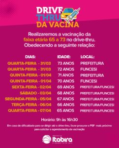 A estratégia visa acelerar a vacinação contra a Covid-19 em Itabira. Serão duas estruturas de drive-thru, na Prefeitura e na Funcesi, funcionando sempre de 9h às 16h30, além dos postos de saúde mais próximos às residências para os acamados e aqueles que não possuem meios de condução para irem aos estacionamentos.