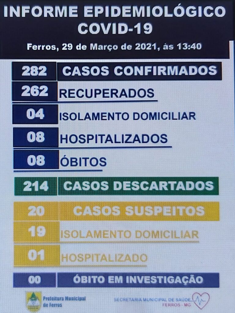 Ver mais + O Boletim Epidemiológico Covid-19 da Prefeitura Municipal de Ferros (MG), divulgado nesta segunda-feira (29/03), mostra que o município tem 282 casos confirmados e 08 óbitos registrados. Veja os números abaixo: Veja também 30/03: HNSD registra 93º óbito por covid-19 Informe Epidemiológico Coronavírus MG 30/03/2021