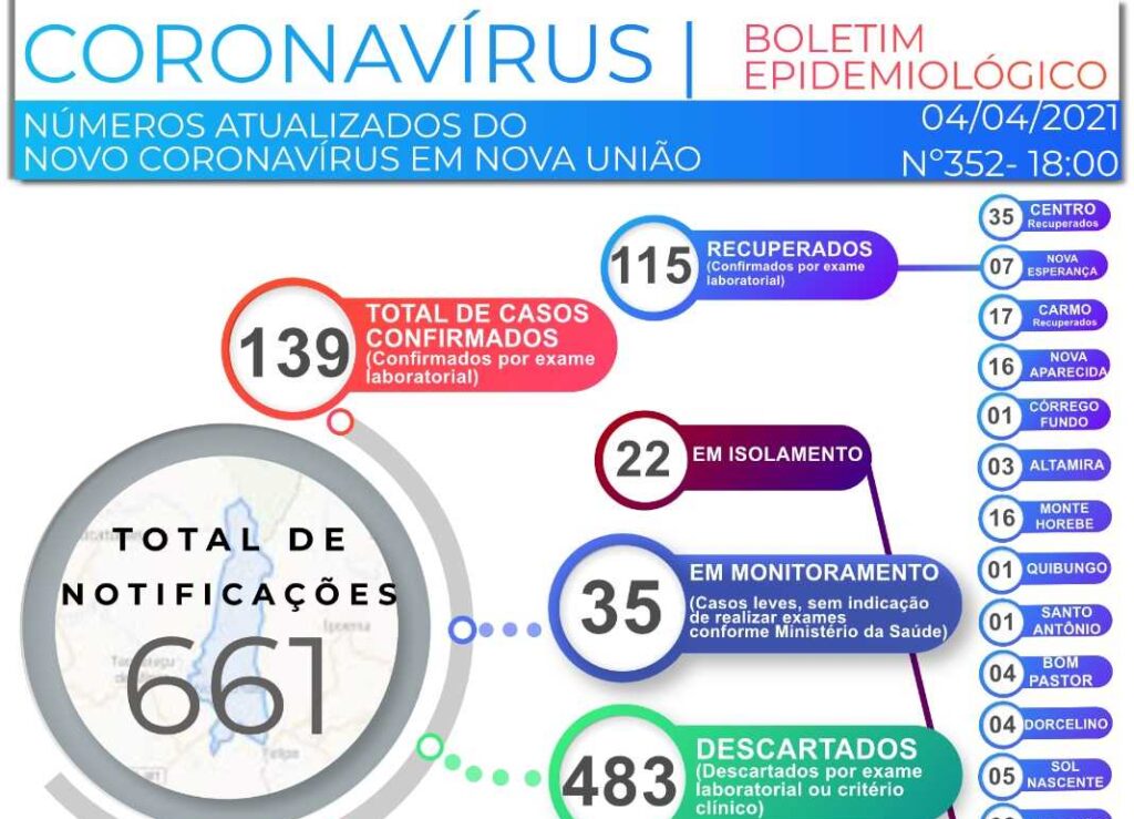 Ver mais + O Boletim Epidemiológico Coronavírus (Covid-19) da Prefeitura Municipal de Nova União (MG), divulgado no domingo (04/04/21) através da Secretaria Municipal de Saúde, mostra que o município tem 139 casos confirmados e 02 óbitos registrados. Veja o boletim completo: Veja também Santa Maria tem 16 óbitos por coronavírus HNSD registra dois óbitos de […]