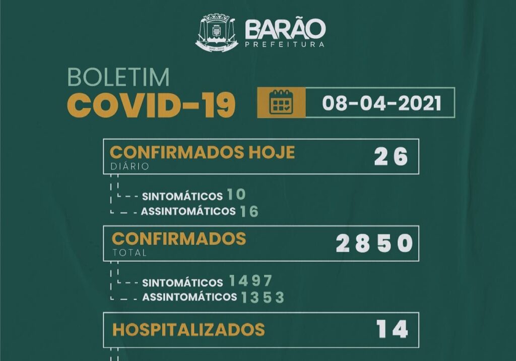 Ver mais + O Boletim Epidemiológico Coronavírus (Covid-19) da Prefeitura Municipal de Barão de Cocais (MG), divulgado nesta quinta-feira (08/04/21) através da Secretaria Municipal de Saúde, mostra que o município tem 2.850 casos confirmados e 52 óbitos registrados. Veja o boletim completo: Veja também Informe Epidemiológico Coronavírus MG 9/4/2021 Estado recebe 478.150 doses para imunizar […]