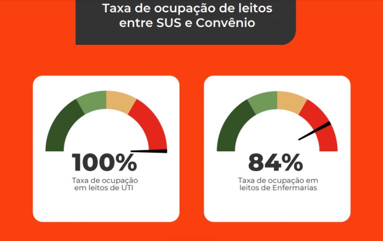 A taxa de ocupação dos leitos de Unidade de Terapia Intensiva (UTI), para pacientes com coronavírus é de 100%. Os leitos de enfermaria, a taxa de ocupação regrediu para 84% da sua capacidade.