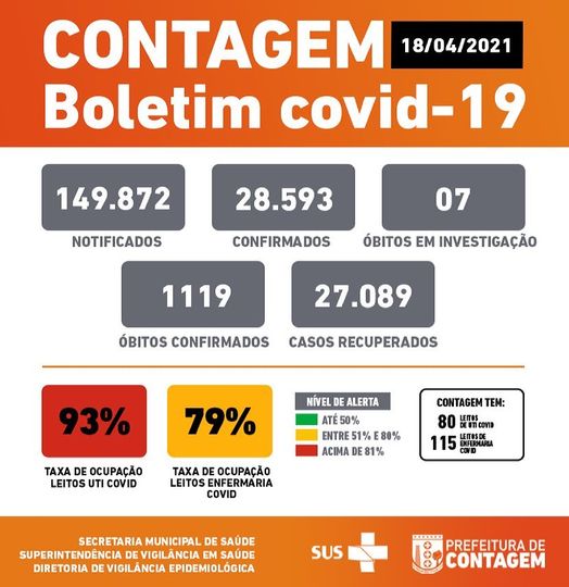 O Boletim Epidemiológico Coronavírus (Covid-19) da Prefeitura Municipal de Contagem (MG), divulgado neste domingo (18/04/21) através da Secretaria Municipal de Saúde, mostra que o município tem 149.872 casos confirmados e 1.119 óbitos registrados. Veja os números abaixo: