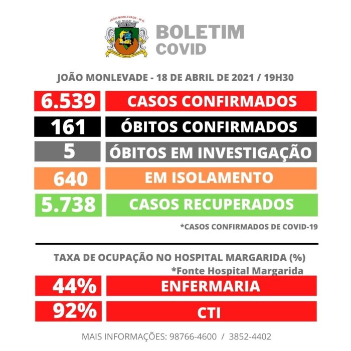 O Boletim Epidemiológico Coronavírus (Covid-19) da Prefeitura Municipal de João Monlevade (MG), divulgado na noite de domingo (18/04/21) através da Secretaria Municipal de Saúde, mostra que o município tem 6.539 casos confirmados e 161 óbitos registrados. Veja os números abaixo:
