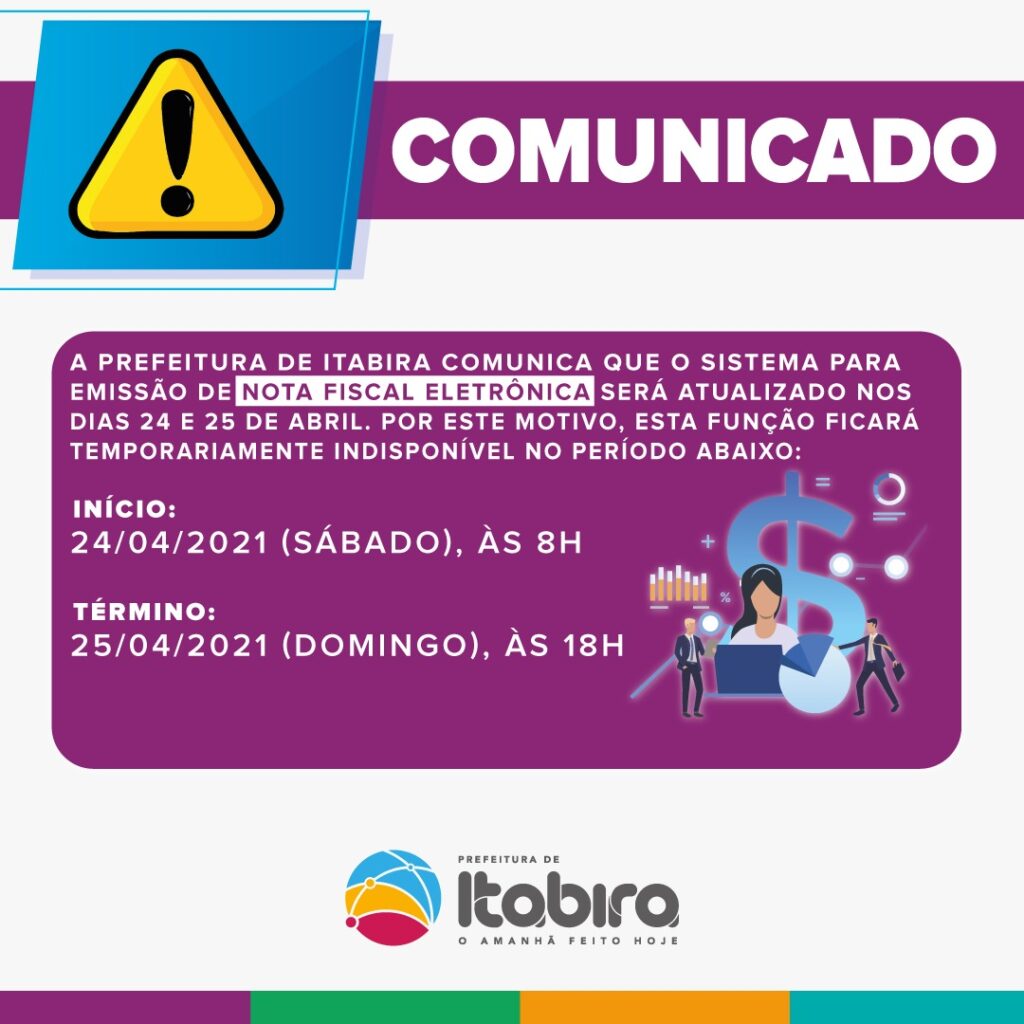 A Prefeitura de Itabira comunica que a emissão de Nota Fiscal de Serviços Eletrônica (NFS-e) estará temporariamente indisponível neste sábado (24) e domingo (25). Haverá atualização do sistema e, por isso, esta função estará bloqueada. Ressalta-se que o procedimento não afetará o acesso aos demais serviços disponíveis no portal da Prefeitura (www.itabira.mg.gov.br). A Secretaria Municipal […]