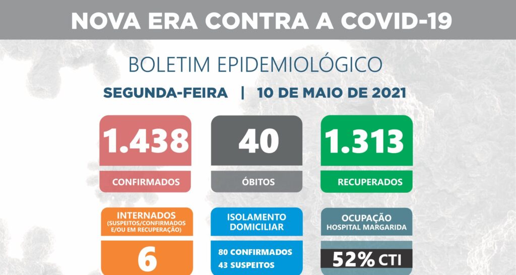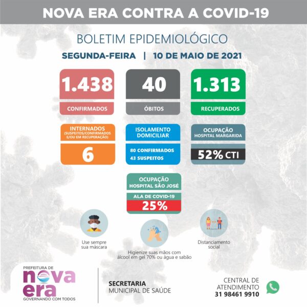 O Boletim Epidemiológico Coronavírus (Covid-19) da Prefeitura Municipal de Nova Era (MG), divulgado na segunda-feira (10/05/21) através da Secretaria Municipal de Saúde, mostra que o município tem 1.438 casos confirmados e 40 óbitos registrados.