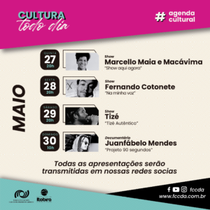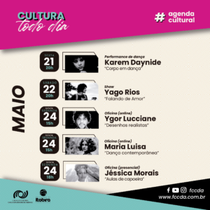 Para este mês de maio teremos apresentações exclusivas de artistas itabiranos, com muitas atrações da nova cena cultural da cidade. Na parte de oficinas traremos oportunidades de formação em dança contemporânea, capoeira e de desenhos artísticos. Para fechar a programação de maio, será lançado o documentário “90 segundos”, que trará um pouco do universo do rap itabirano para as telas.