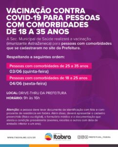 Covid-19: pacientes com comorbidades de 18 a 35 anos e pessoas com deficiência sem BPC podem vacinar A vacinação acontece para quem já efetuou o cadastro no portal da Prefeitura de Itabira.