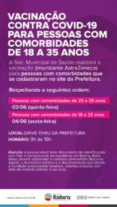 – Dia 04/06 – sexta-feira – imunização para pessoas com comorbidades de 18 a 25 anos.