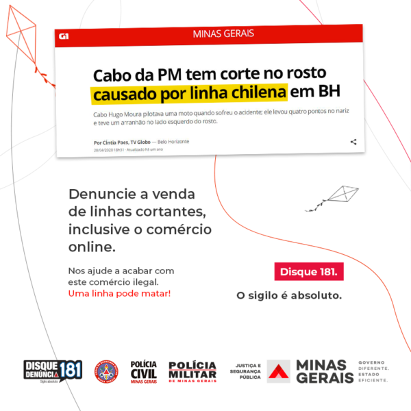 Um balanço do 181 aponta 539 denúncias de comércio ilegal de linha chilena e cerol em Minas Gerais durante todo o ano de 2020. Em 2021, somente no primeiro semestre, já foram recebidas 426 denúncias – número que, com a campanha, deve crescer ainda mais. Em caso de flagrantes de alguém soltando pipa ou papagaio com linhas cortantes, a orientação é acionar o 190 ou a Guarda Municipal.