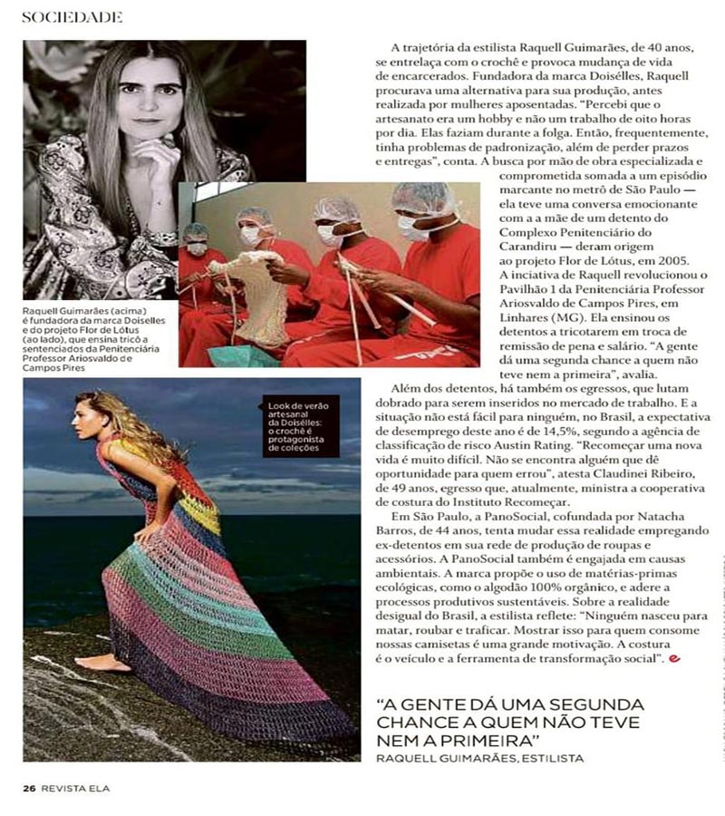 A estilista e primeira-dama de Itabira, Raquell Guimarães, foi destaque na edição deste domingo (25) do jornal O Globo. Fundadora da marca Doisélles, Raquell contou à coluna Ela, do jornal O Globo, sobre sua trajetória de sucesso no mundo da moda e o projeto Flor de Lótus, idealizado por ela, e que trabalha com a ressocialização de sentenciadas através do tricô.