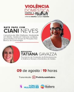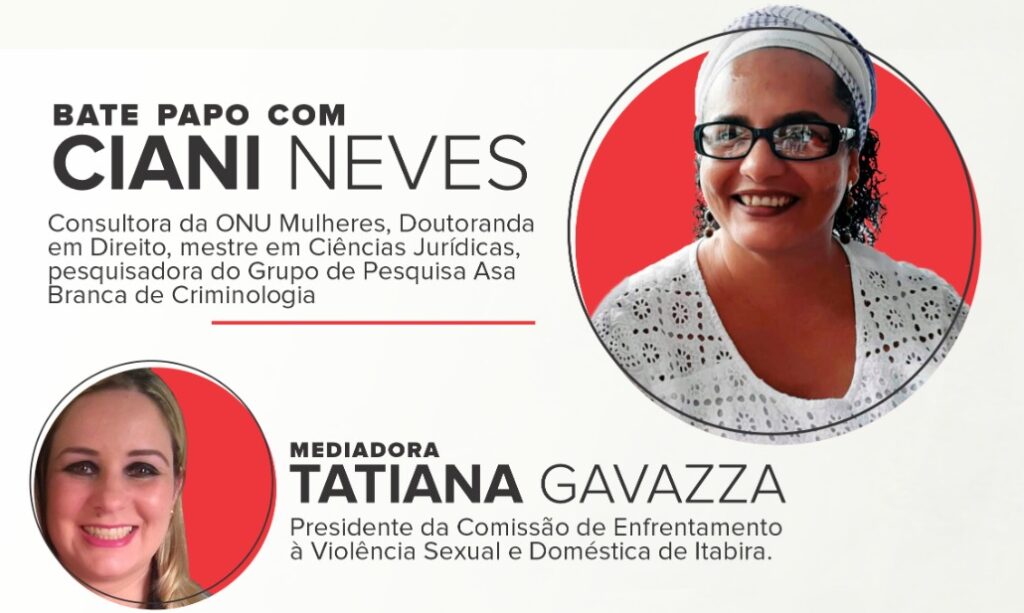 O bate -papo será com a consultora da ONU Mulheres, doutoranda em Direito, mestre em Ciências Jurídicas, pesquisadora do Grupo Asa Branca de Criminologia, Ciani Neves. A mediação será feita pela presidente da Comissão de Enfrentamento à Violência Sexual e Doméstica de Itabira, a psicóloga Tatiana Gavazza.