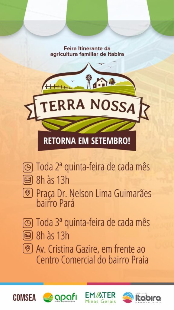 Feira itinerante “Terra Nossa” volta a funcionar neste mês em Itabira Está confirmado: a partir deste mês, Itabira contará novamente com a feira itinerante “Terra Nossa” dos agricultores familiares. A atividade acontecerá na praça Doutor Nelson Lima Guimarães, no bairro Pará, na segunda quinta-feira de cada mês. Na semana seguinte, as estruturas serão montadas na […]