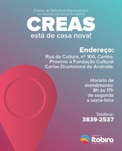 A partir desta terça-feira (14), o Centro de Referência Especializado de Assistência Social de Itabira (Creas) começa a atender em novo endereço, na rua da Cultura, nº 100, no bairro Centro. O local, próximo à Fundação Cultural Carlos Drummond de Andrade (FCCDA), foi escolhido para assistir melhor a comunidade.