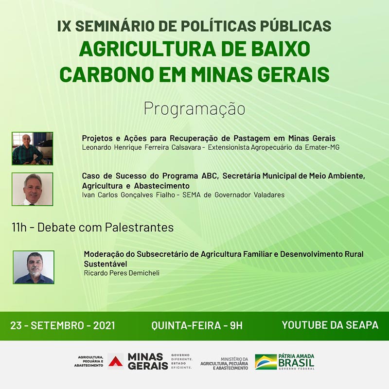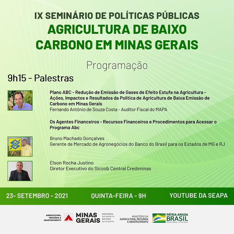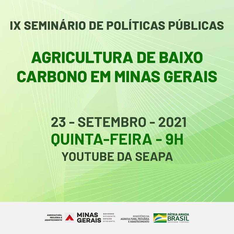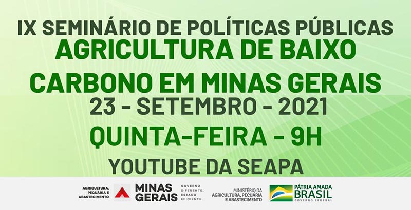 A Agricultura de Baixo Carbono em Minas Gerais é o tema do IX Seminário de Políticas Públicas, promovido pela Secretaria de Agricultura, Pecuária e Abastecimento (Seapa), em parceria com o Ministério da Agricultura, Pecuária e Abastecimento (Mapa). O evento será realizado de forma virtual, nesta quinta-feira (23/9), às 9h, com transmissão pelo Canal da Seapa no Youtube.