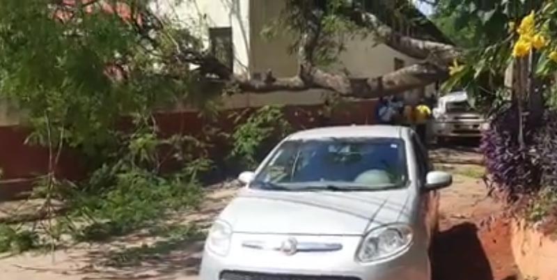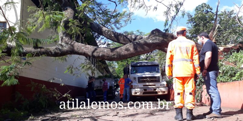 Uma árvore cuja raiz está comprometida não suportou o próprio peso e acabou caindo e atingindo um muro, telhado e galpão do SENAI/Itabira. Ninguém ficou ferido.