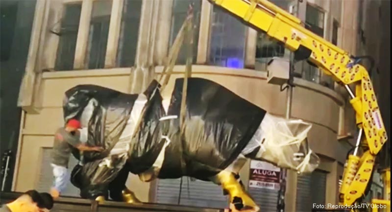 Após muita polêmica em torno de sua instalação naquele local, a estátua do Touro de Ouro, colocada na frente da Bolsa de Valores (B3) em São Paulo, foi retirada do Centro da capital paulista na noite desta terça-feira (23/11). De acordo com a assessoria da B3, a remoção aconteceu por volta das 21h57.