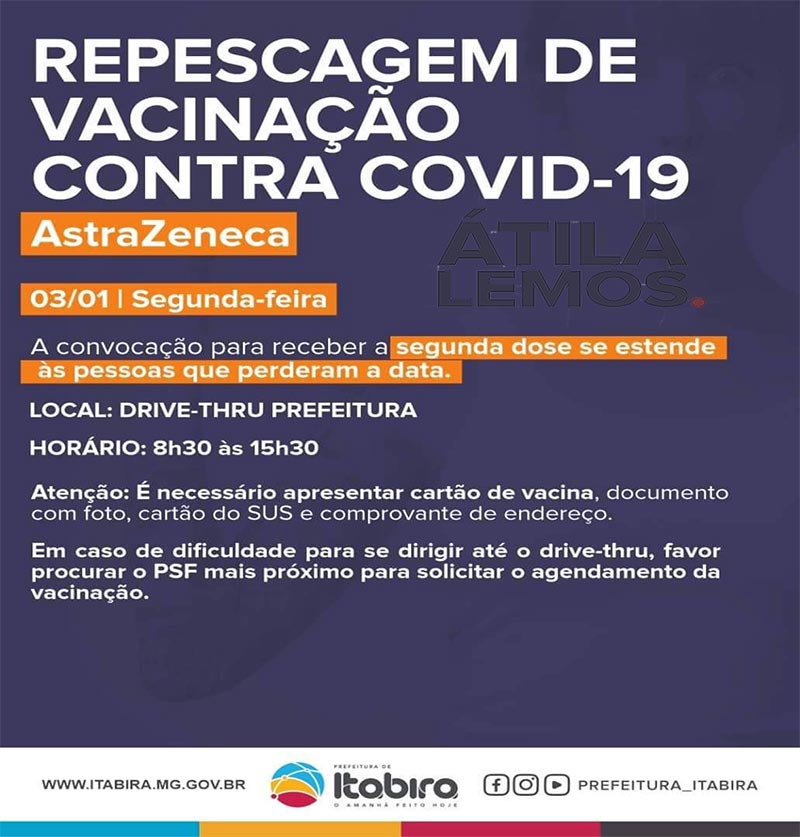 As pessoas que ainda não tomaram a segunda dose da vacina contra a Covid-19 e aquelas que precisam tomar a dose de reforço devem ficar atentas. A Secretaria Municipal de Saúde (SMS) está convocando os usuários que perderam a data da segunda dose do imunizante Astrazeneca para a campanha de repescagem. A vacinação para este grupo acontecerá no drive-thru da Prefeitura de Itabira, nesta segunda-feira (3), das 8h30 às 15h30.