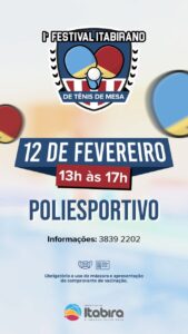 O Ginásio Poliesportivo Maestro Silvério Faustino ficará bastante movimentado neste sábado (12). No local, haverá o encerramento do I Festival Itabirano de Tênis de Mesa, promovido pela Prefeitura de Itabira, por meio da Secretaria Municipal de Esporte, Lazer e Juventude (SMELJ). A festividade será das 13h às 17h, respeitando todos os protocolos sanitários de proteção à Covid-19: uso obrigatório de máscara, álcool em gel e distanciamento social.