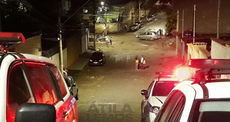 Acionados os Policiais militares seguiram para o local onde depararam com o homem apresentando escoriações no braço, o que seria provocado por queda ao solo, quando fugiu dos tiros, em mesmo instante e local os Militares localizaram a mulher baleada na panturrilha e próximo da linha férrea.