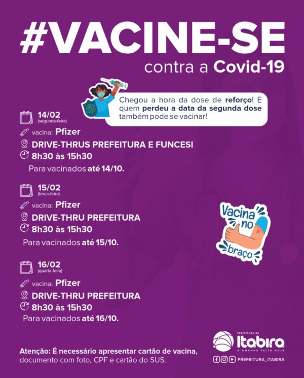 Vacinação contra a covid-19 continua nesta segunda-feira (14/02) em Itabira