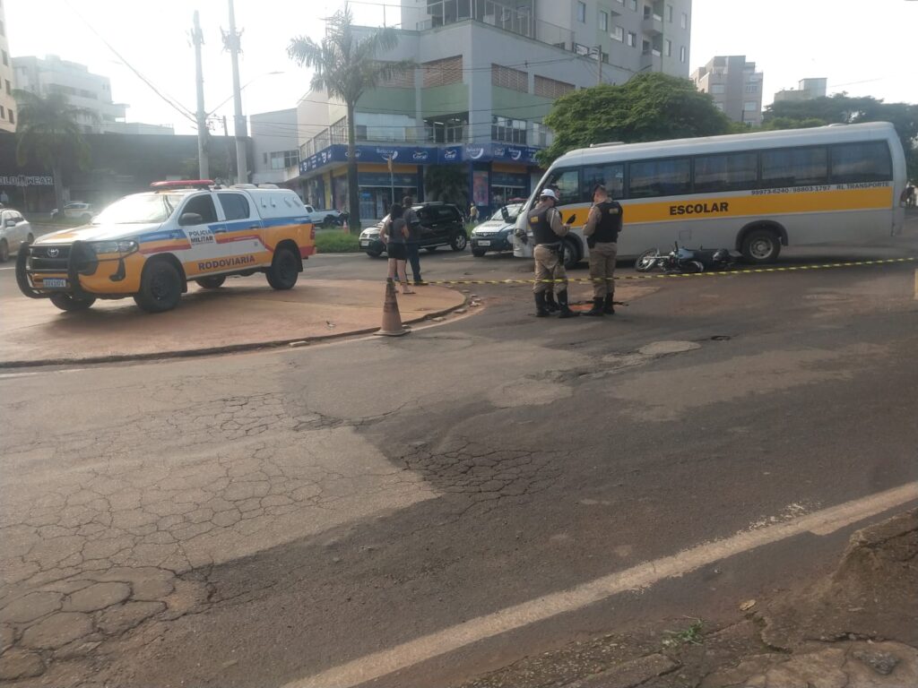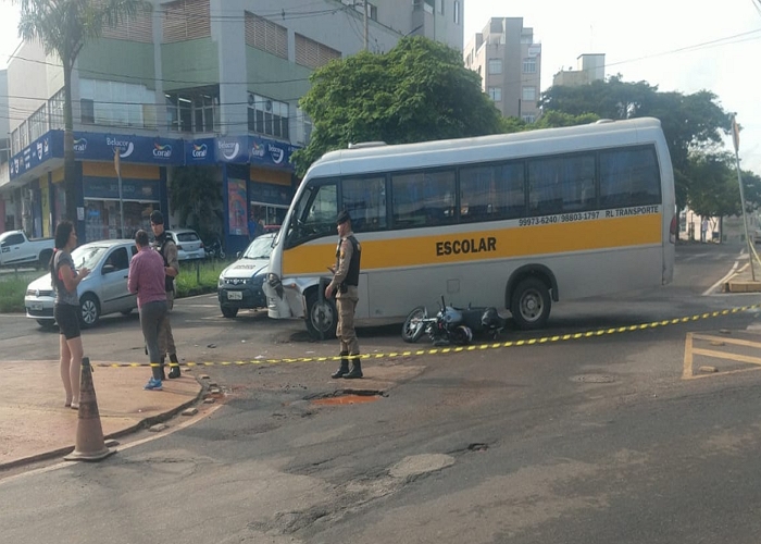 O motorista do micro ônibus escolar contou que fez a parada obrigatória e observou o trânsito, porém ao arrancar o veículo foi surpreendido pela motocicleta que surgiu repentinamente.
