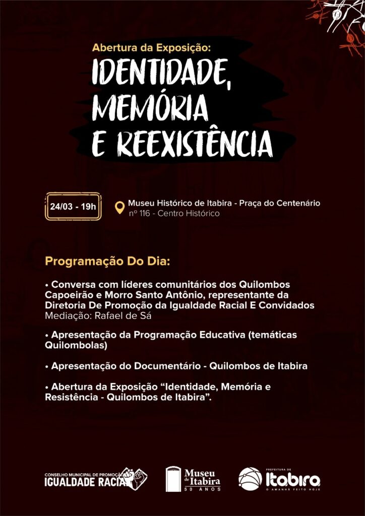 Museu recebe exposição Identidade, Memória e Resistência – Quilombos de Itabira. A abertura da mostra acontece na quinta-feira (24) e contará com o lançamento da programação educativa do museu. O Museu Histórico de Itabira receberá nesta quinta-feira (24), às 19 horas, a exposição Identidade, Memória e Resistência – Quilombos de Itabira. Na oportunidade, a instituição […]
