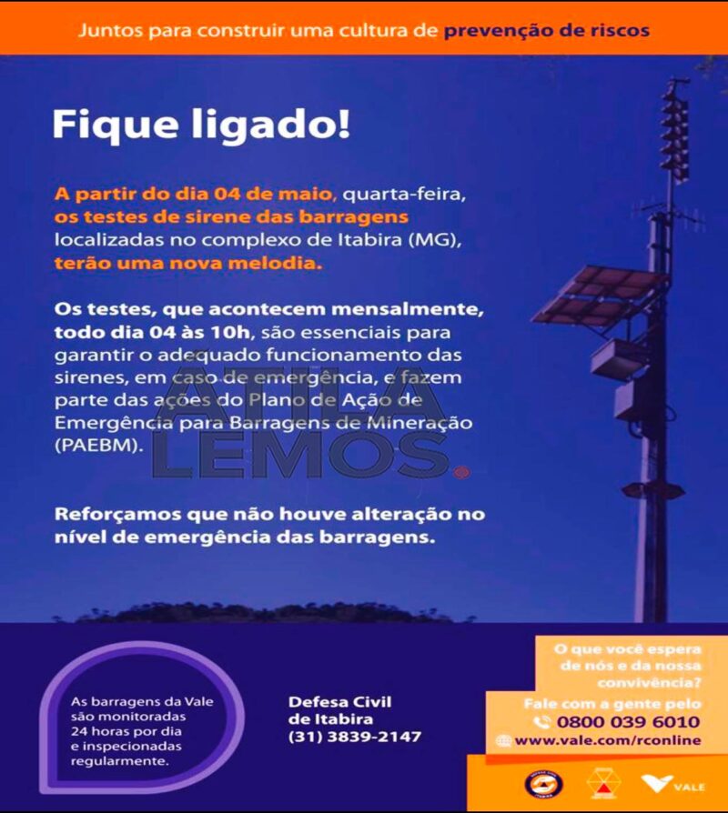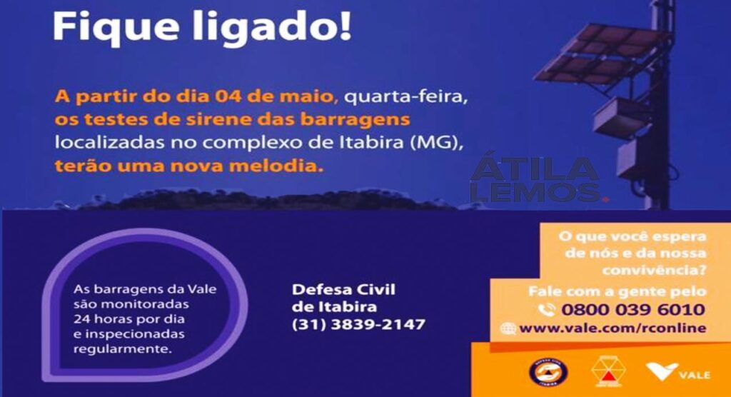 De acordo com o cartaz a partir do dia 4 de maio, quarta-feira, os testes de sirene das barragens localizadas no complexo de Itabira (MG), terão uma nova MELODIA.