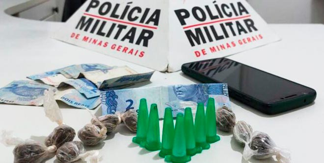 Os militares realizaram a abordagem, sendo localizados 07 (sete) pinos de substância esbranquiçada análoga a cocaína, 09 (nove) buchas esverdeadas de substancia análoga a maconha, R$8,00 (oito) reais em notas de dois, um aparelho de telefone celular marca Motorola, cor rosa.
