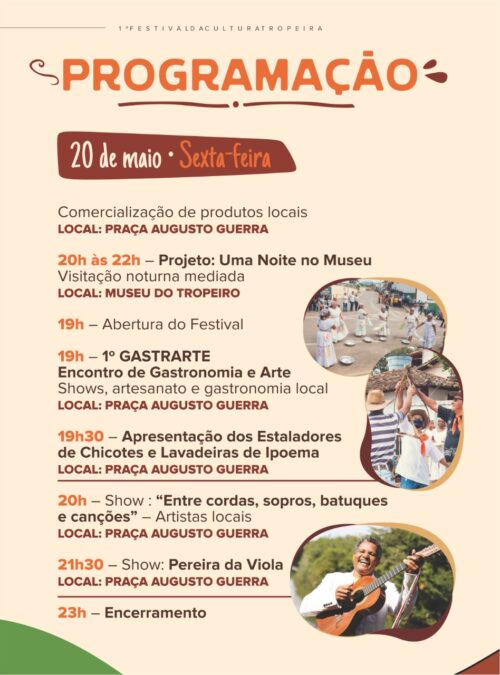 Começa nesta sexta-feira (20) e vai até o dia 28 de maio o 1º Festival da Cultura Tropeira, no distrito de Ipoema. Promovido pela Prefeitura de Itabira e com uma ampla programação, o festival promete movimentar o distrito com música, oficina, gastronomia tropeira, seminário e muito mais atividades.