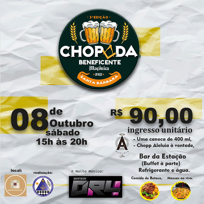 A 3ª Chopada Beneficente da Loja Maçônica Luz das Estrelas – Santa Bárbara (MG), será realizada no sábado, dia 08 de outubro de 2022, no horário de 15h às 20h nas dependências do Bar da Estação, Rua da Estação, 65, Centro, e contará com cinco horas de Chopp totalmente free e terá show com a Banda DR4, além da participações especiais.