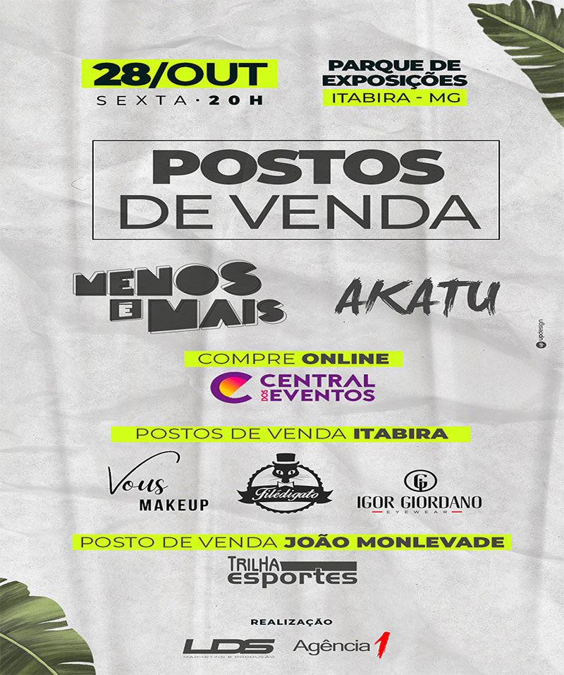 Pela primeira vez em Itabira o Grupo Menos é mais promete um show inesquecível no dia 28 outubro, em terras drummondianas. Acompanhado do Grupo Akatu, que promete samba no pé, os organizadores do evento preparam uma megaestrutura, layout inovador e inédito para o Parque de Exposição.