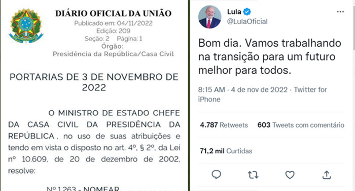 Usando a frase “Bom dia. Vamos trabalhando na transição para um futuro melhor para todos”, o presidente eleito Lula postou a portaria Portaria número 1.263 nomeando Geraldo José Rodrigues Alckmin Filho para coordenar a Transição Governamental.