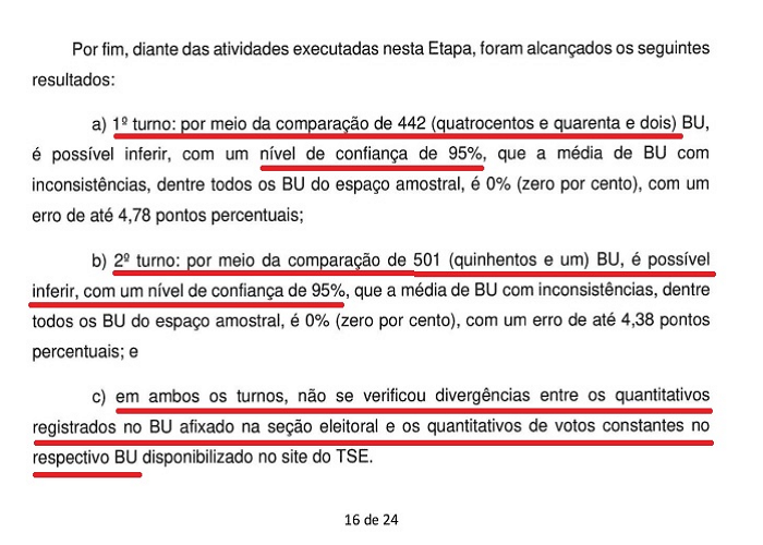 “Do trabalho realizado, destaco dois pontos. Primeiro, foi observado que a ocorrência de acesso à rede, durante a compilação do código-fonte e consequente geração dos programas (códigos binários), pode configurar relevante risco à segurança do processo. Segundo, dos testes de funcionalidade, realizados por meio do Teste de Integridade e do Projeto-Piloto com Biometria, não é possível afirmar que o sistema eletrônico de votação está isento da influência de um eventual código malicioso que possa alterar o seu funcionamento”.