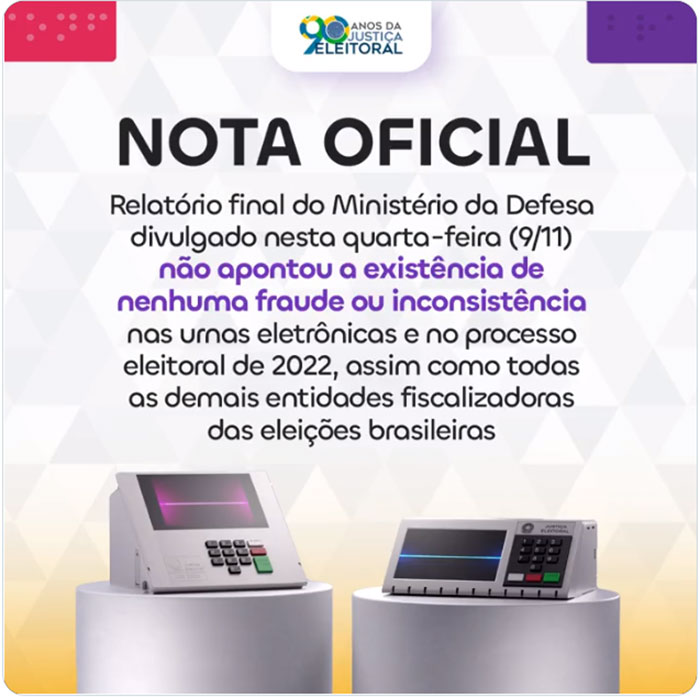 O TSE reafirma que as urnas eletrônicas são motivo de orgulho nacional, e que as Eleições de 2022 comprovam a eficácia, a lisura e a total transparência da apuração e da totalização dos votos.