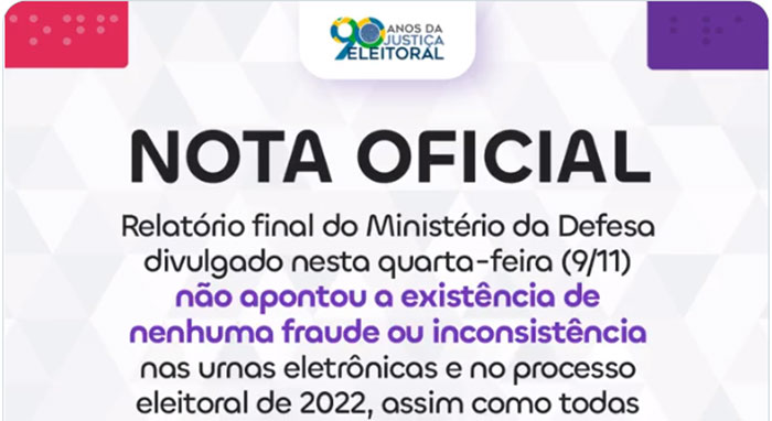 Nota Oficial do TSE, relatório não aponta fraude ou inconsistência nas eleições