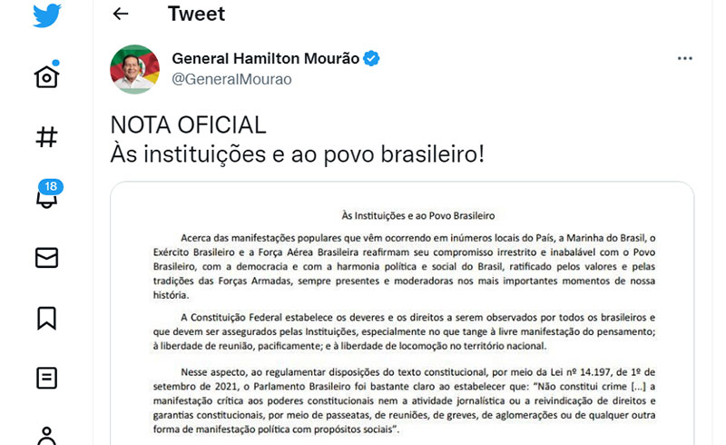 Em suas redes sociais o Vice-presidente do Brasil, General Hamilton Mourão republicou a NOTA das Forças Armadas sobre as urnas eleitorais. NOTA OFICIAL Às instituições e ao povo brasileiro! pic.twitter.com/rtjzjVhCFW — General Hamilton Mourão (@GeneralMourao) November 11, 2022 Veja também: Relatório das Forças Armadas não excluiu a possibilidade de fraude ou inconsistência nas urnas eletrônicas